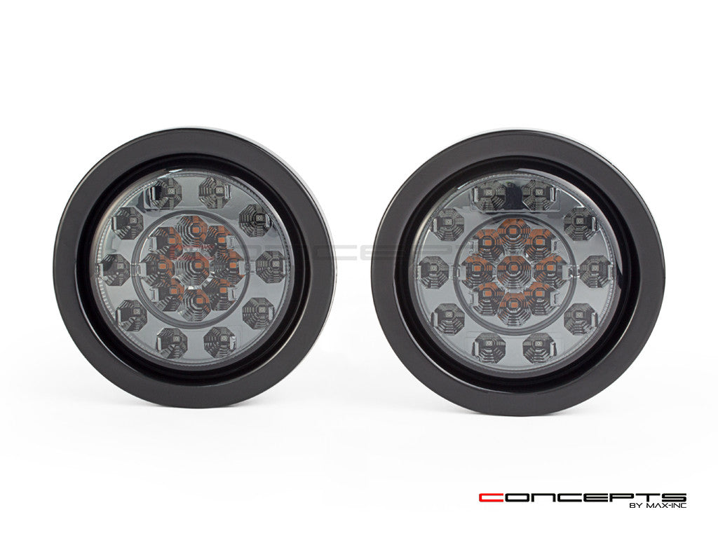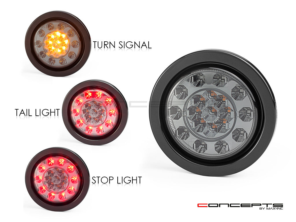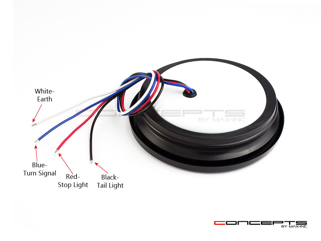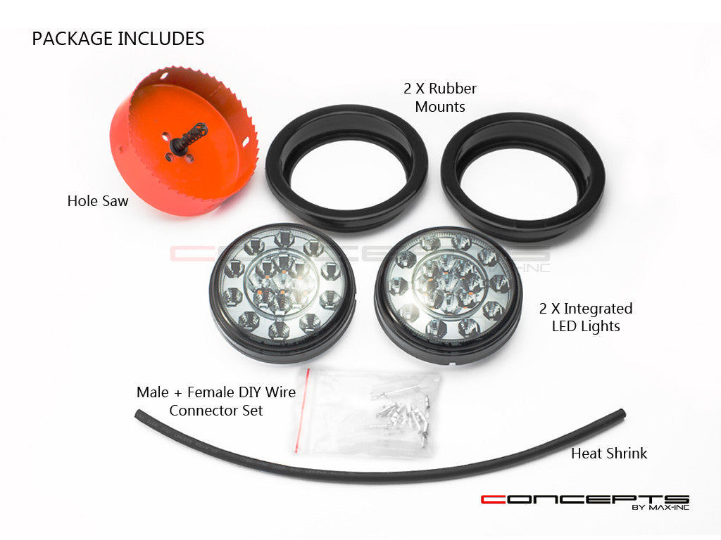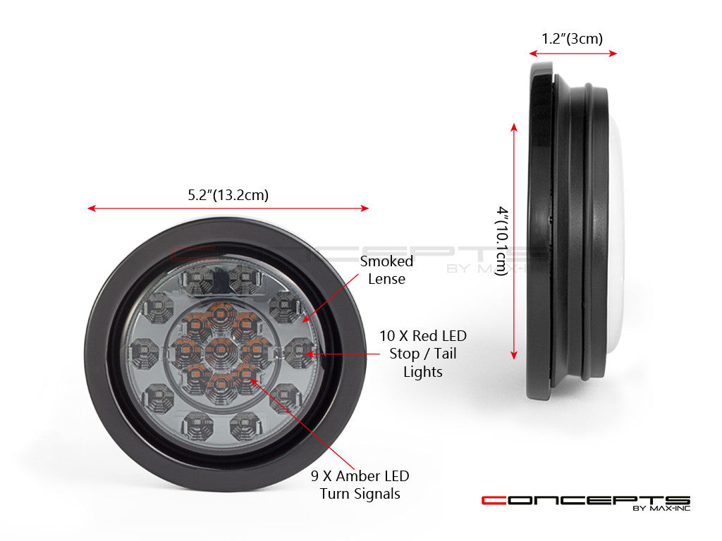 MAX INC CONCEPTS ALL-IN-ONE SUPER BRIGHT INTEGRATED TAIL LIGHTS ARE VERY HIGH QUALITY. FEATURING A COOL SMOKED LENS AND 3 FUNCTIONS - RED LED STOP & TAIL LIGHTS + AMBER LED TURN SIGNALS. PROVIDED IN THE KIT IS THE CORRECT SIZE HOLE SAW AND BULLET WIRE CONNECTORS FOR EASY DIY INSTALLATION. TO INSTALL YOU SIMPLY DRILL A HOLE IN YOUR PANEL OR FENDER, THEN PLACE THE RUBBER RING INTO THE HOLE AND PUSH THE LIGHT INTO THE CENTER OF THE RUBBER RING.