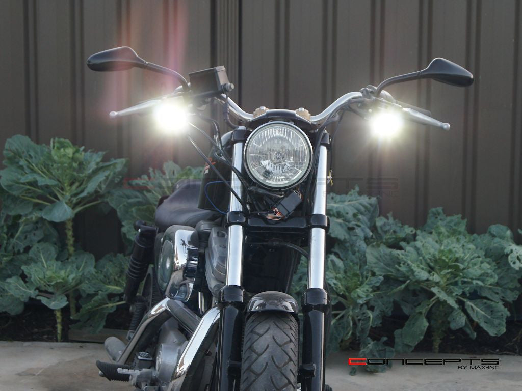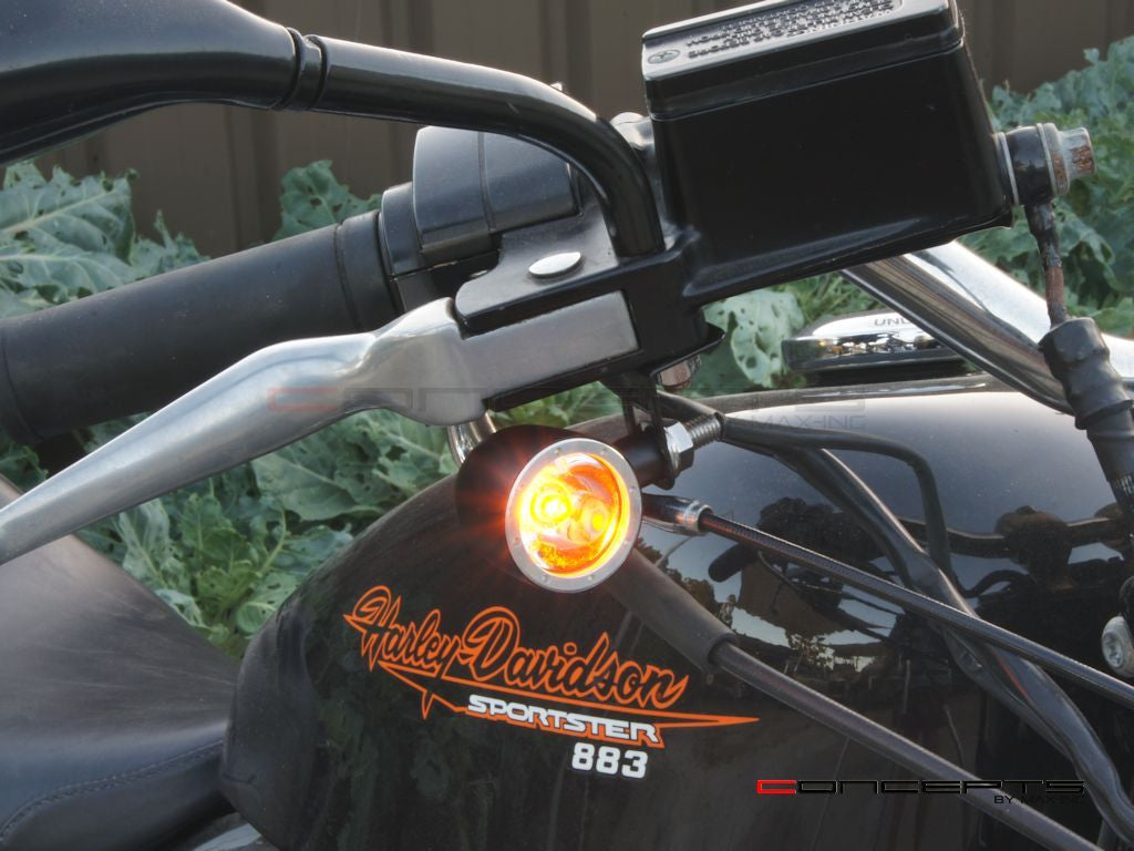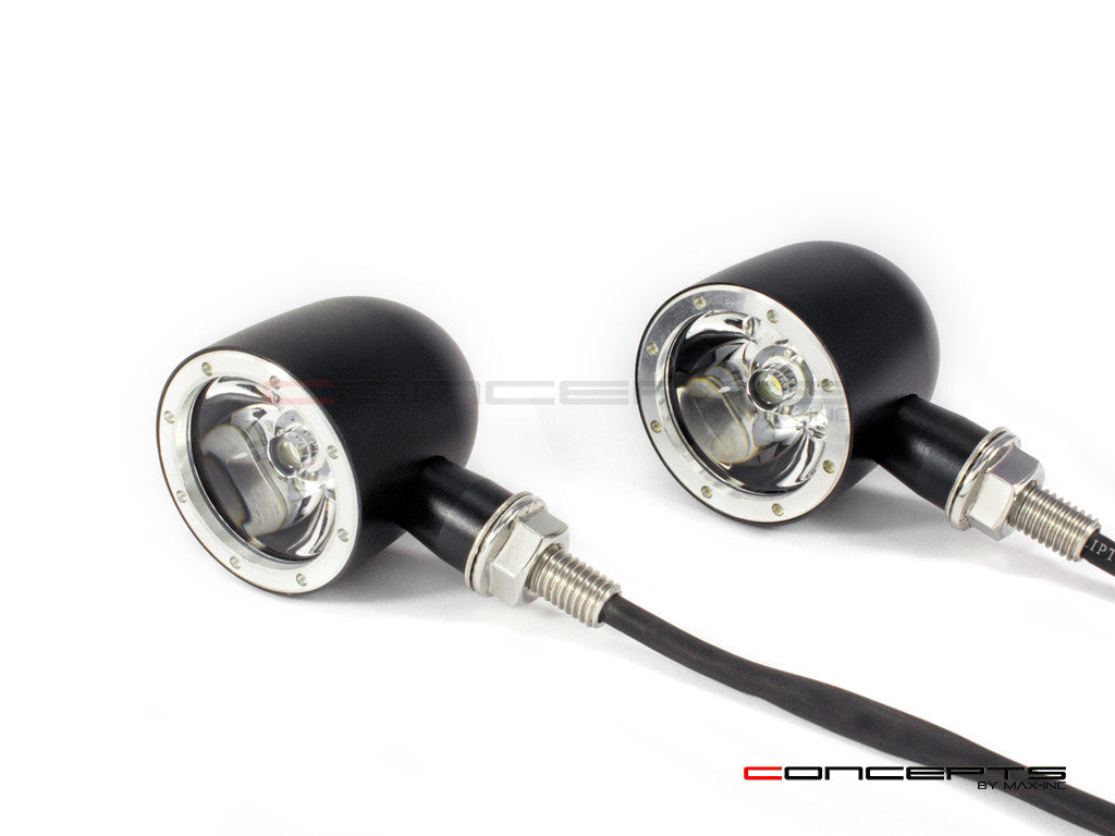 These Integrated LED Turn Signals are CNC machined, super bright and are very high quality. They offer a unique solution for the front of your motorcycle combining Turn Signals & Daytime Running Lights which offer increased visibility and a cool look, all packed into an all-in-one small & discreet housing. They feature a Super Bright Dual Color 3w Cree LED Chip and a projector lens which magnifies the light. The Dual Colored LED changes color between functions - Amber LED for your Turn Signals and a White LED for your Daytime Running Lights. These Integrated Turn Signals are our exclusive design and are only available directly through Max Inc and our selected dealers.