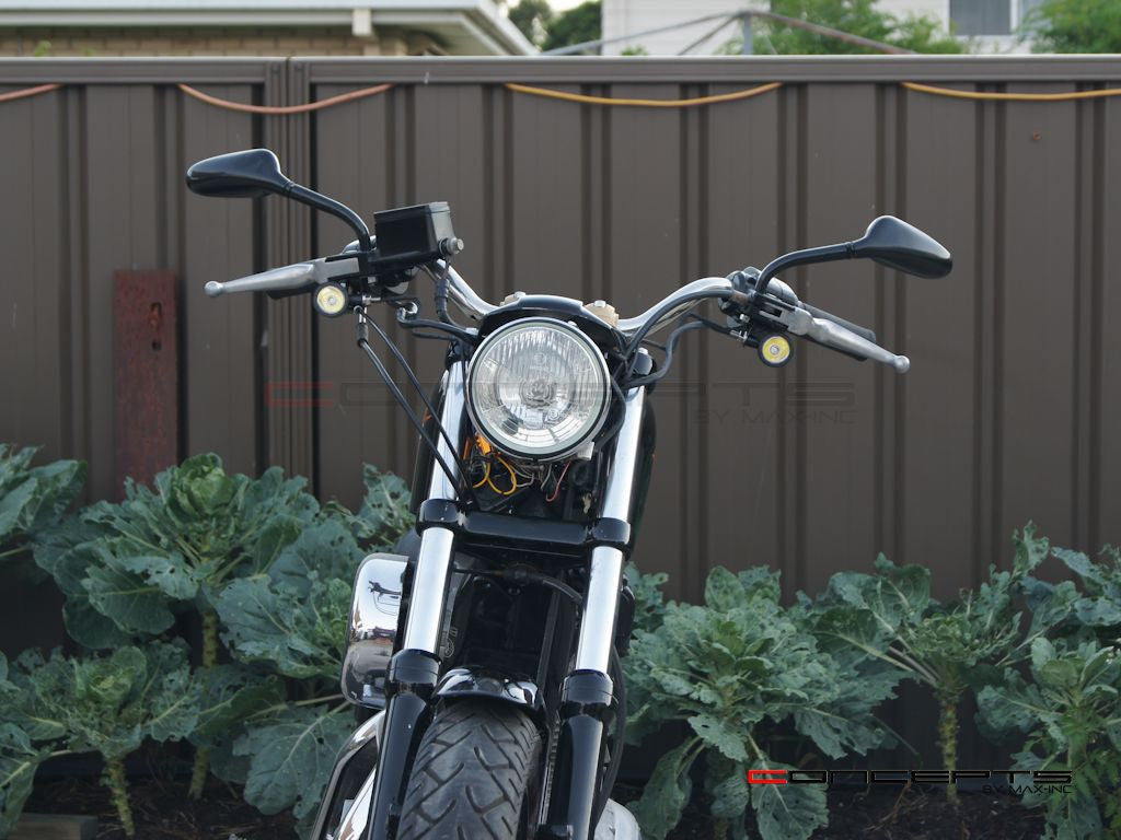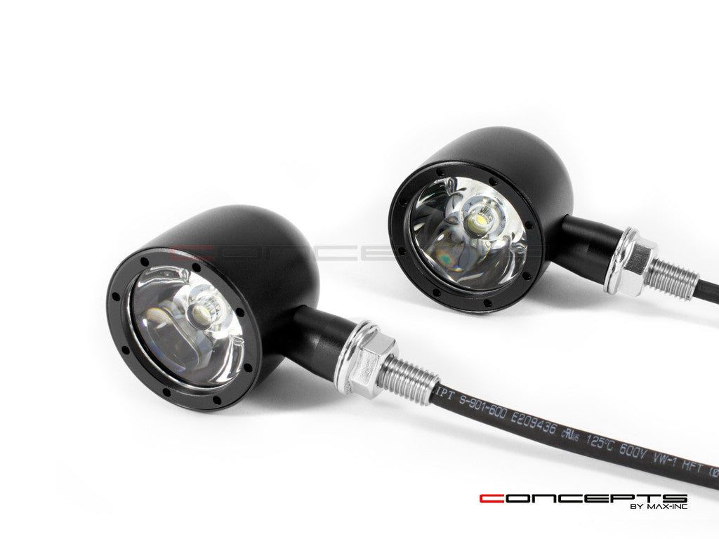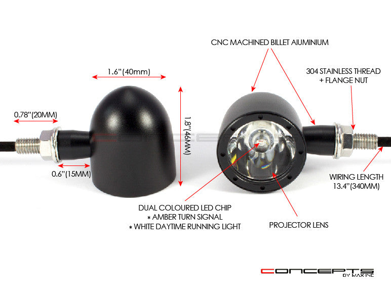 These Integrated LED Turn Signals are CNC machined, super bright and are very high quality. They offer a unique solution for the front of your motorcycle combining Turn Signals & Daytime Running Lights which offer increased visibility and a cool look, all packed into an all-in-one small & discreet housing. They feature a Super Bright Dual Color 3w Cree LED Chip and a projector lens which magnifies the light. The Dual Colored LED changes color between functions - Amber LED for your Turn Signals and a White LED for your Daytime Running Lights. These Integrated Turn Signals are our exclusive design and are only available directly through Max Inc and our selected dealers.