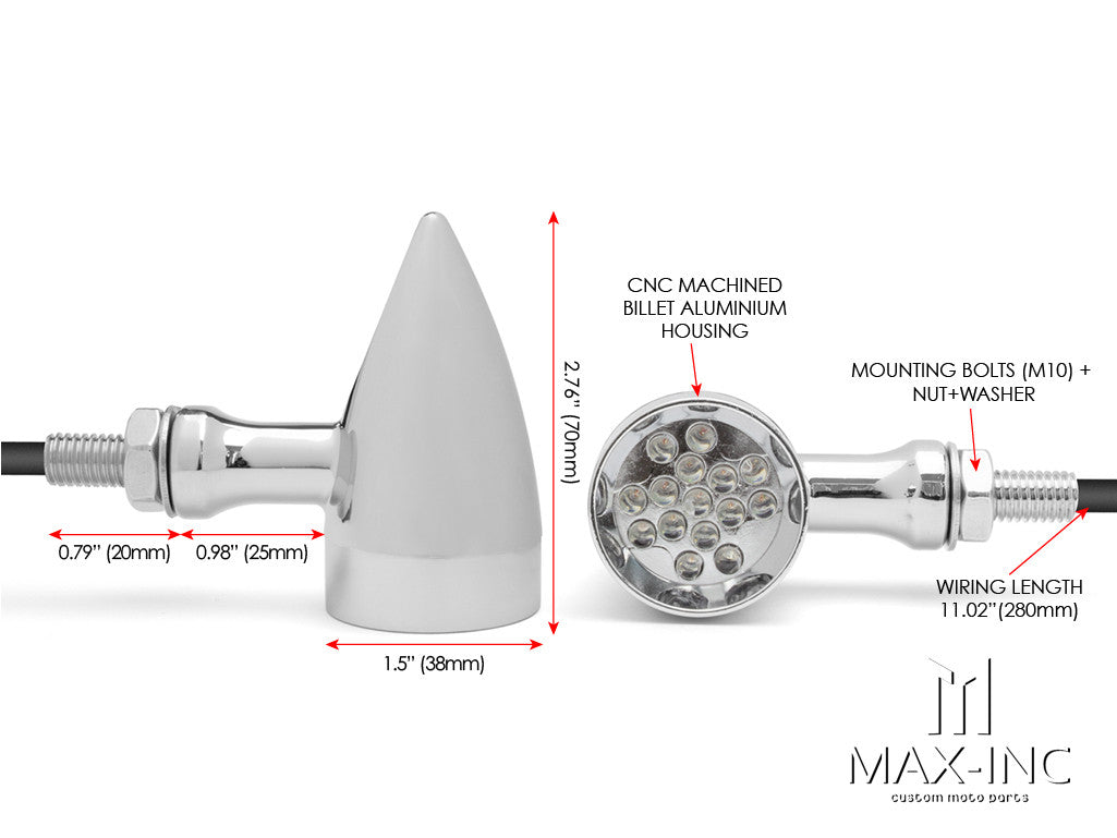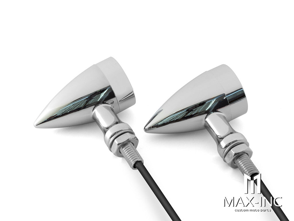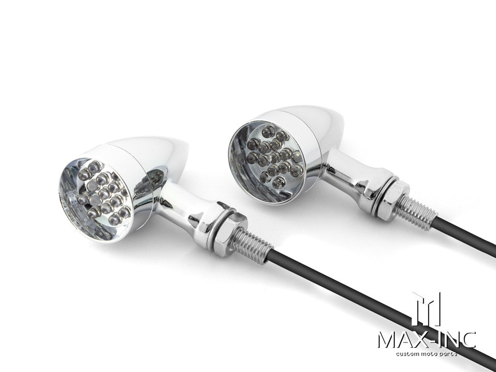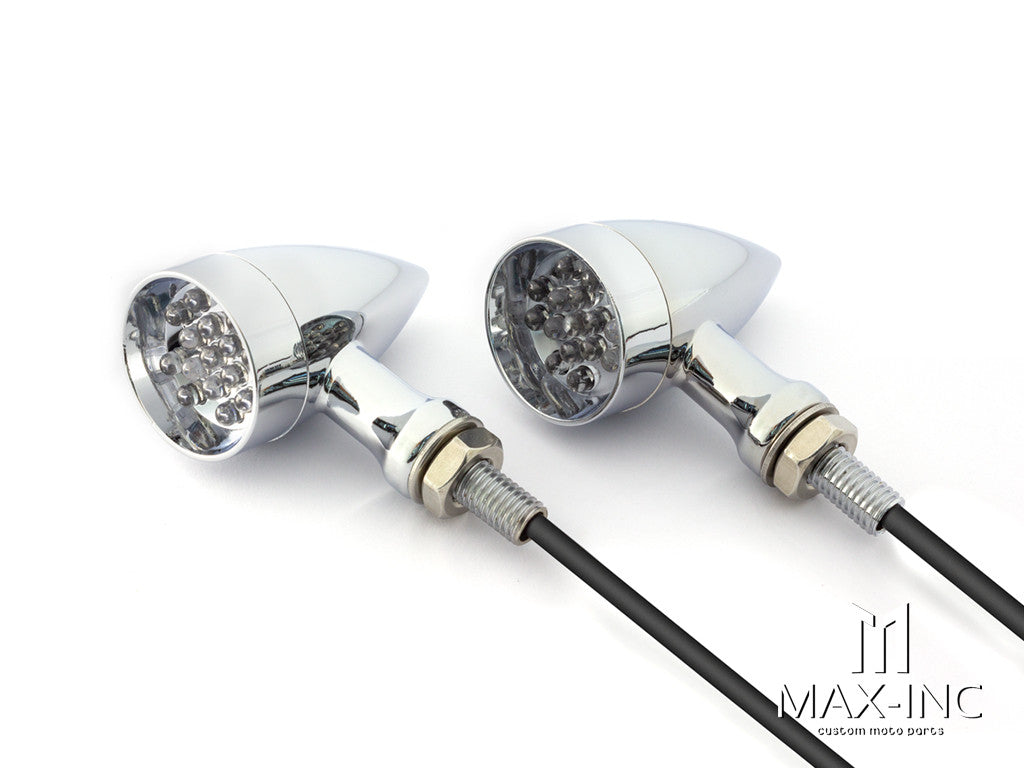 These high-quality turn signals combine a classic shape with modern LED technology. The housing is crafted from cast zinc alloy, providing durability and a sleek appearance with its deep chrome finish.