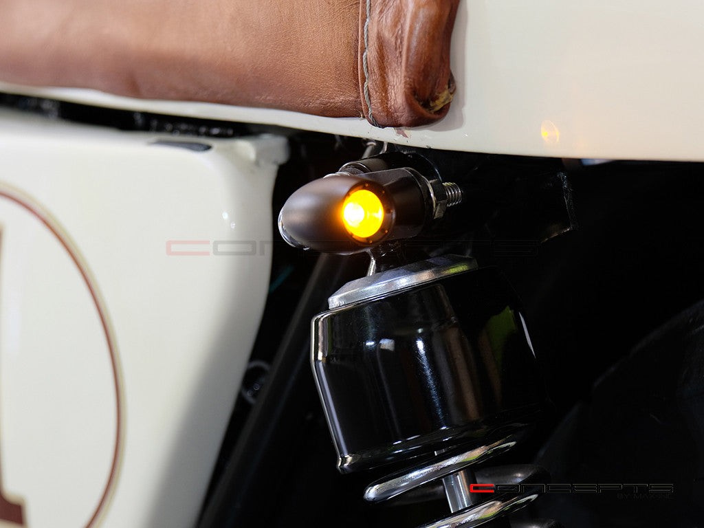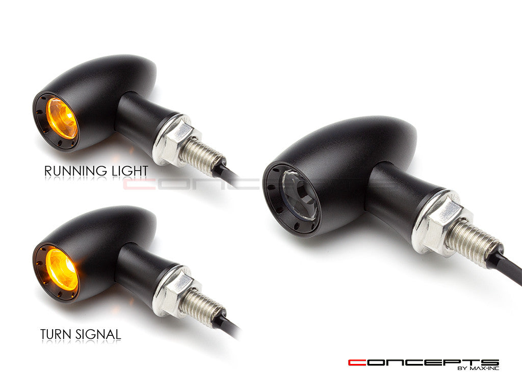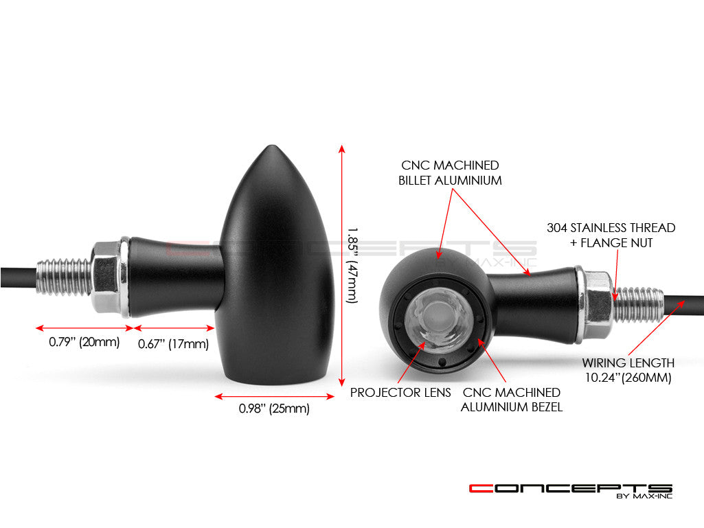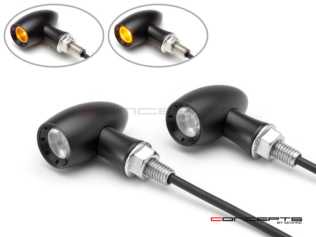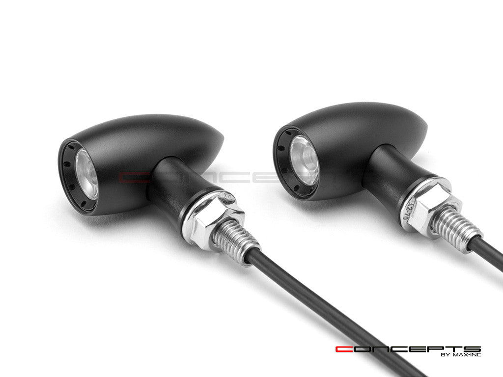 These high quality turn signals are machined from solid 6061 billet aluminum. Internally they feature a super bright dual intensity high powered amber CREE LED chip with a projector lens. The dual intensity function allows you to use them as both running lights and turn signals. They are super small and super bright and will suit fussy buyers looking for high end turn signals at an affordable price. Available only through MAX INC and approved dealers.