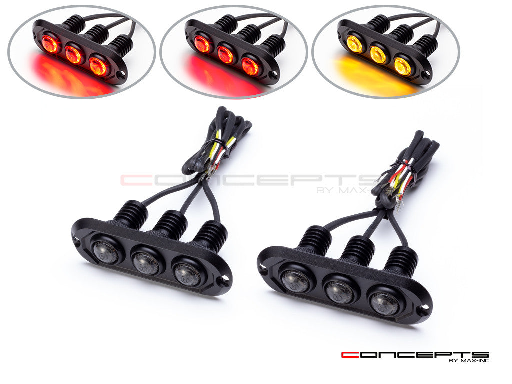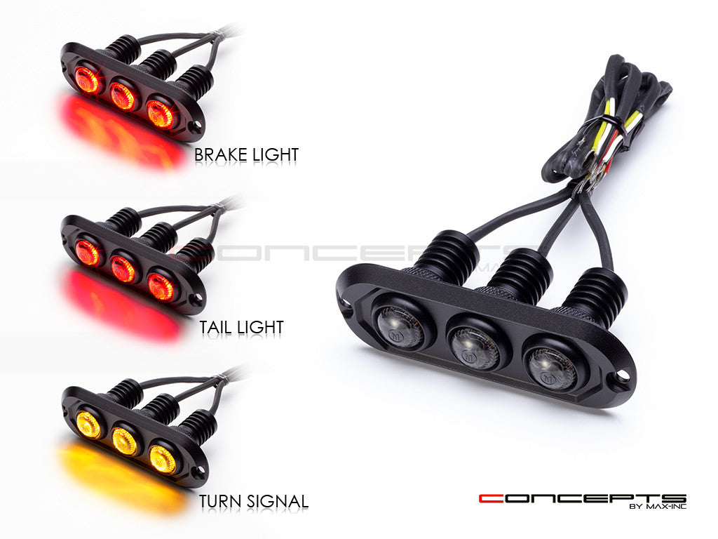 These Integrated LED Turn Signals are CNC machined, super bright and super small. They combine all the functions needed for the rear of your vehicle packed into an all-in-one tiny housing. They feature a Super Bright Dual Color LED Chip covered by a projector lens which magnifies the light. The Dual Colored LED changes color between functions - Amber LED for Turn Signals and 2 stage Red LED for your Stop & Tail Lights. These Integrated Turn Signals are our exclusive design and are only available directly through Max Inc and our selected dealers.