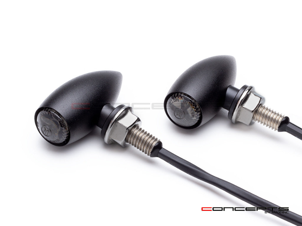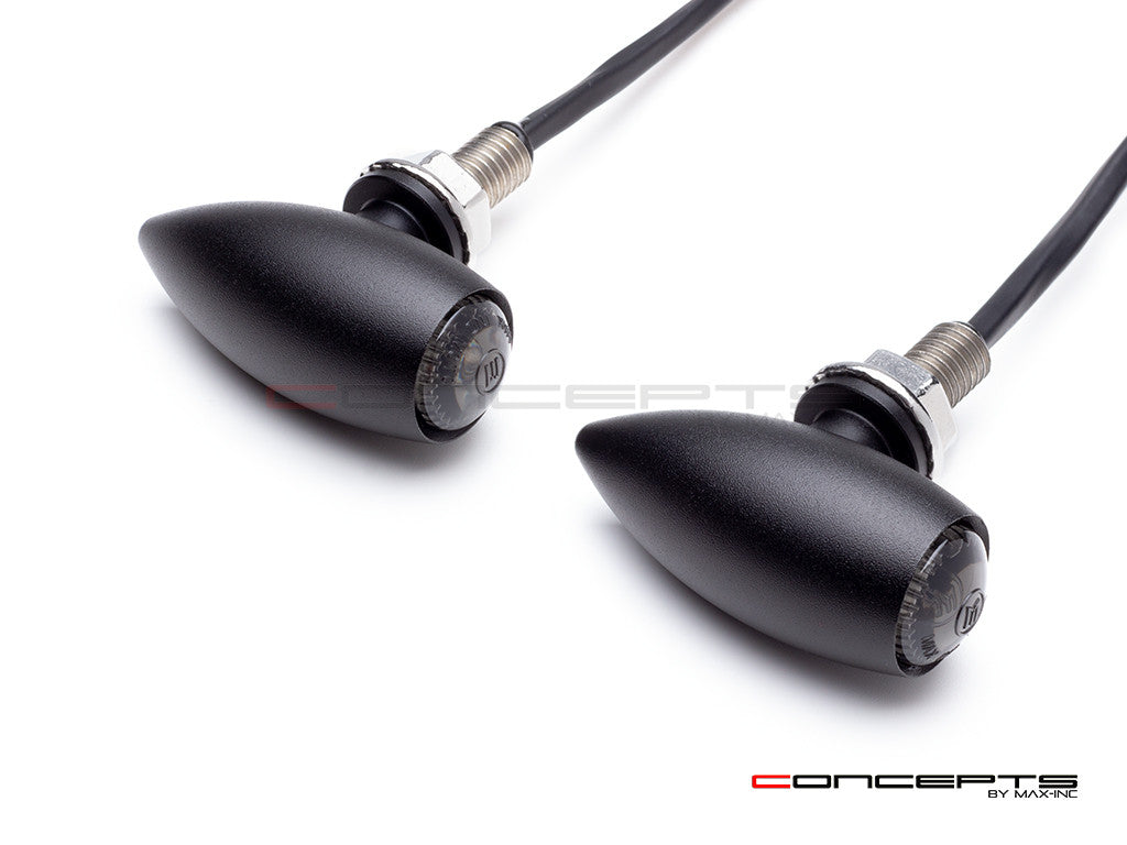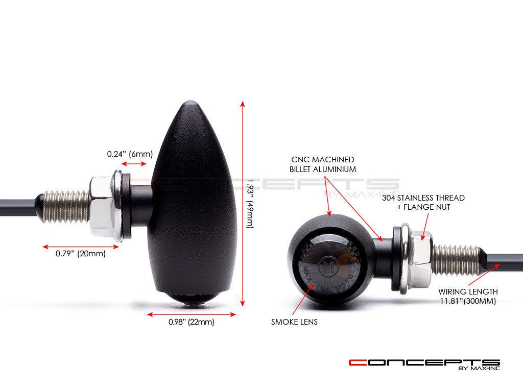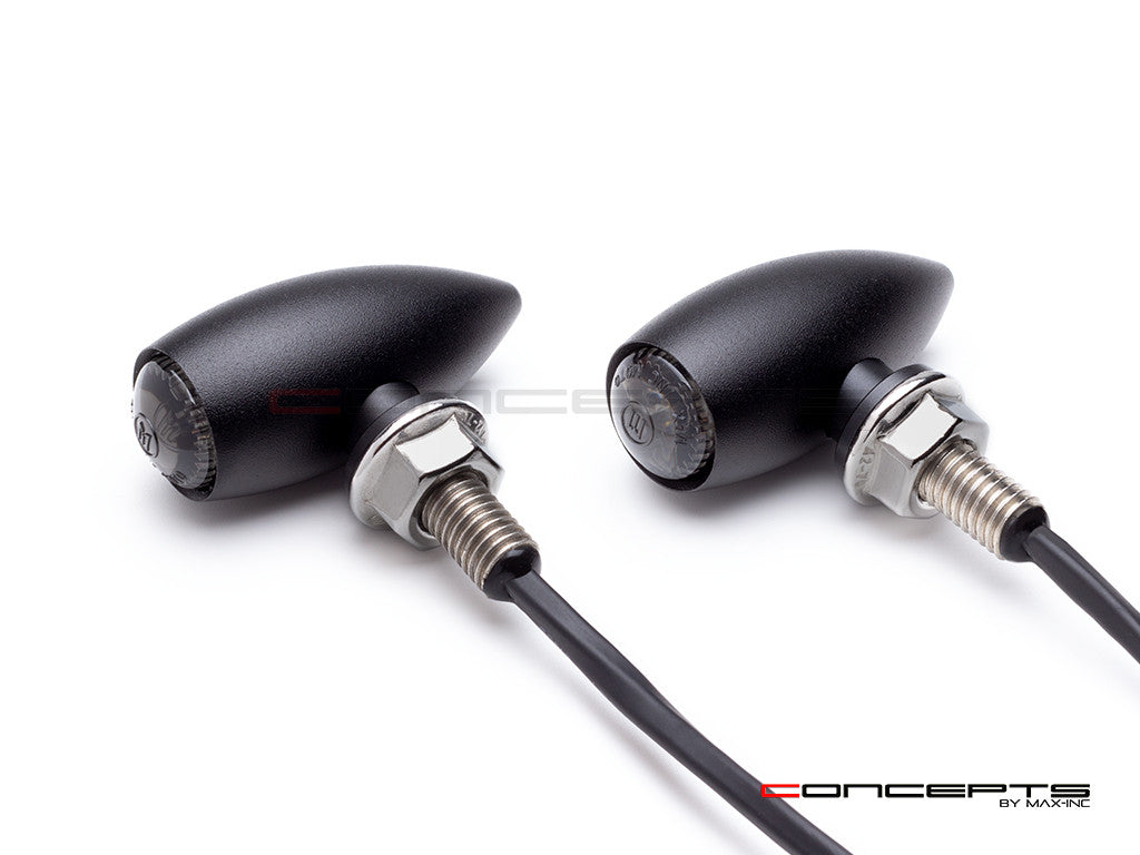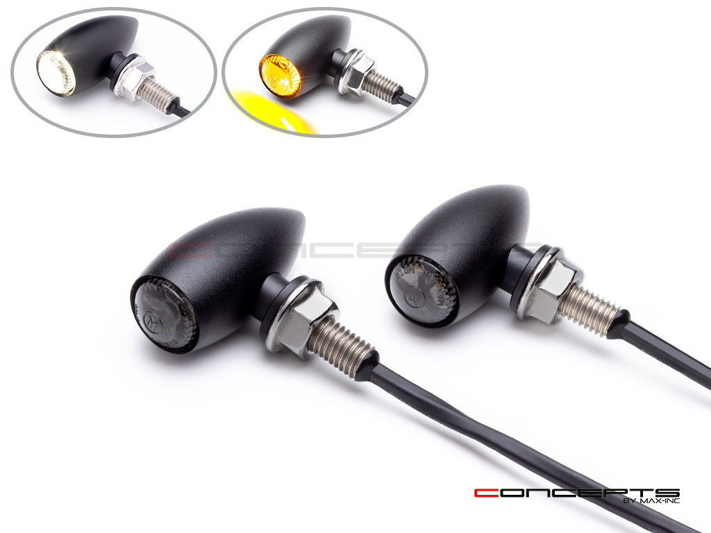 These Integrated LED Turn Signals are CNC machined, super bright and super small. They combine all the functions needed for the front of your motorcycle packed into an all-in-one tiny housing. They feature a Super Bright Dual Color LED Chip covered by a projector lens which magnifies the light. The Dual Colored LED changes color between functions - Amber LED for Turn Signals and White LED for your Daytime Running Lights. These Integrated Turn Signals are our exclusive design and are only available directly through Max Inc and our selected dealers.