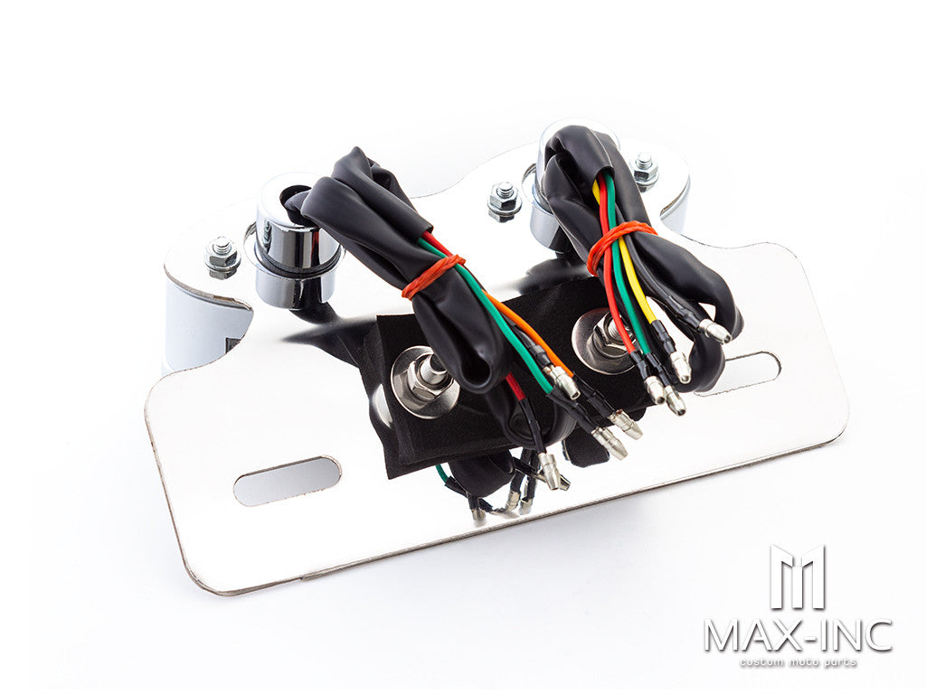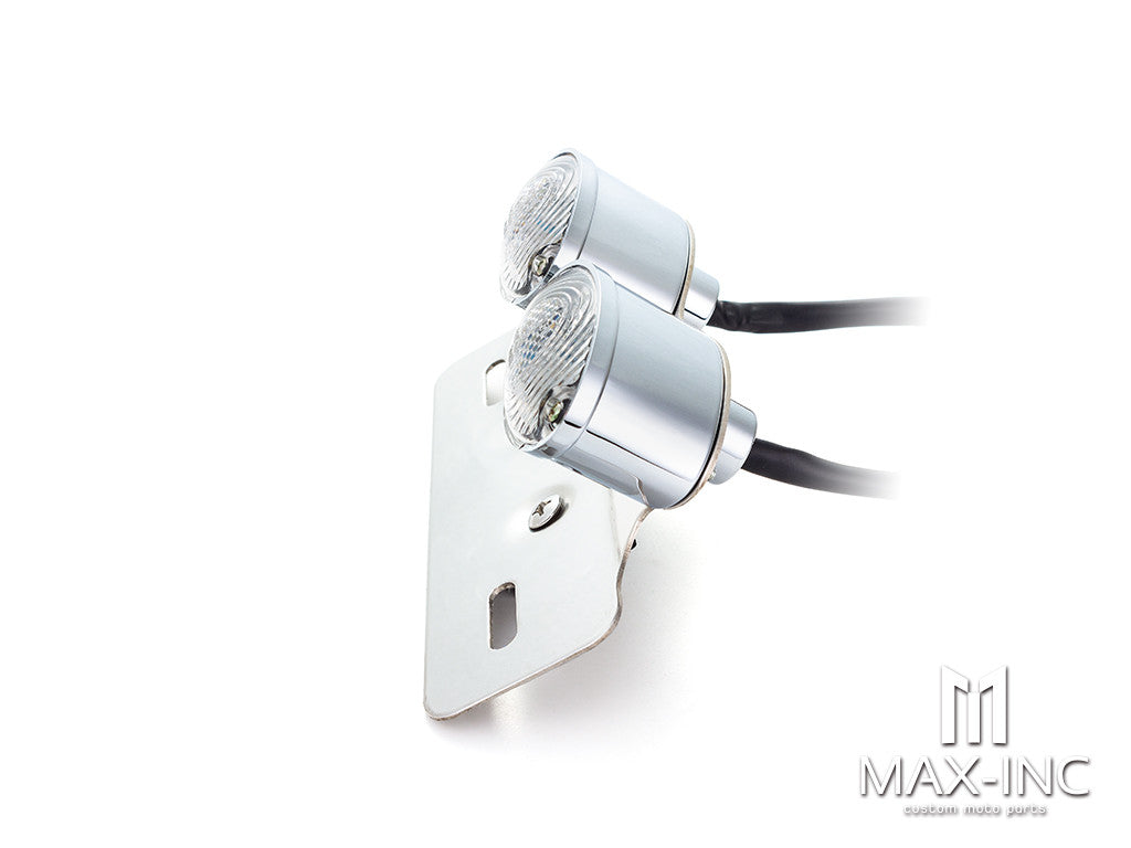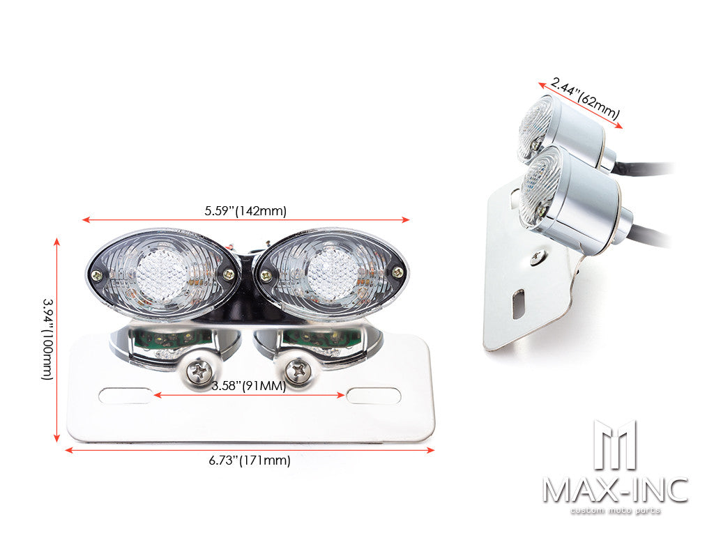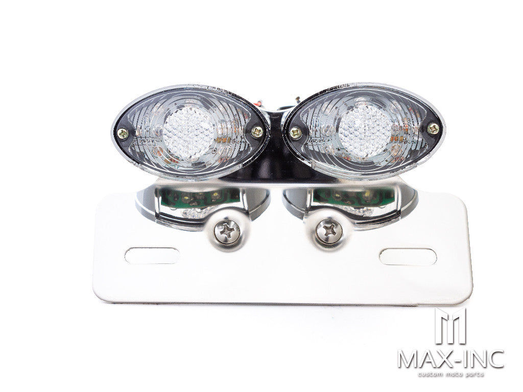 Upgrade your motorcycle's rear lighting and turn signals with the Chrome Double Cat Eye LED Stop / Tail Light. This high-quality LED rear light features integrated turn signals and a license plate holder, providing a versatile and stylish addition to various motorcycle styles, including Harley Davidson, cafe racers, scramblers, rat bikes, choppers, and custom motorcycles.