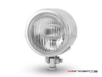 This universal headlight is constructed from metal and features a deep chrome finish. It is designed with a universal bottom mount, allowing it to be easily mounted on various motorcycles.